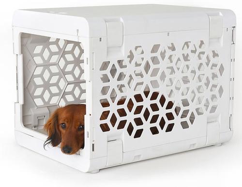 Bought this for my 12 lb shih-tzu to help her feel safe as we transitioned into our new apartment. A little difficult to install and you can very easily break a piece with one wrong move as the plastic is thin. The door is unable to close all the way and lock it, and we're afraid to force it in in the case we won't be able to open it again. Chewy was gracious enough to offer a replacement, but it's just been too hard for us to pack it into a box to return it. So we're keeping the crate as a little alcove for the pup without use of the door or collapsable mechanism.