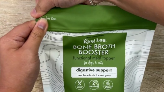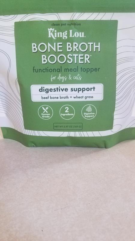 While King Lou Bone Broth Booster seems to be a quality product, it is not to Opal or Porkchop's taste. As it can be presented as either sprinkled powder or mixed liquid, I've tried both forms. They did eventually eat their dog food with the powdered form when I later mixed canned topper food with it. The food topped with the product mixed with water was ignored all day, so we gave up on that. As they will eat it mixed with their canned toppers, I will continue to give it in that form. The powder is very fine and easily mixes with food or water. I will note that Porkchop has had some issues with hard poo and this week that we've been using the topper has been better in that respect. (I can't verify if that is due to the Booster.)
