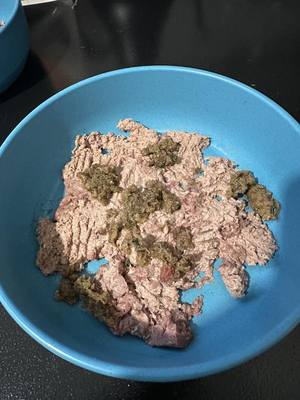 My Chiweenie did not enjoy this. I thought a raw food option would be good to supplement her diet. The freeze dried formula seemed like a convenient option. It has a “freeze-dried” odor which is a little different but not offensive. It is clumpy though and even after adding water, it can be difficult to break up, which I want to do bc my dog is small and some chunks are big and hard and don’t soften up. It wasn’t convenient to spend so much time breaking it up. I introduced slowly and she was eating it but didn’t seem too excited about it. After a few weeks, I increased the amount, and I noticed that she was picking out the larger pieces and placing them outside or a bowl. She would come back and eat them eventually. Today, however, I increased the amount some more and she did not eat it at all it seemed. Usually, she always cleans her plate, but not today. Later in the morning she puked which she never does. She is feeling otherwise and tonight she ate her regular dinner (without this) so I do think for whatever reason, she does not enjoy this and it didn’t agree with her stomach. I will not be purging this again. By the way, I also offered a small bit to my cat and she was not interested in eating it at all. My dog is not a picky eater, but this was not a good choice for her unfortunately.