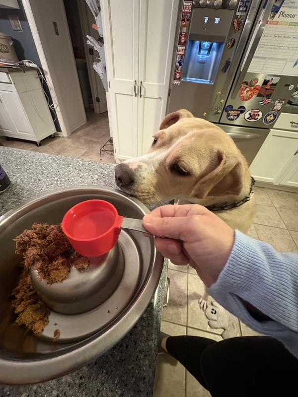 I opened the bag to this one a little surprised to see it looked like chewed up food. It didn’t smell bad though. We had the turkey recipe. My dog wouldn’t leave me alone when I opened the bag and loved it as soon as I put it down. The directions say to mix 1:1 food and any liquid. I used warm water. It definitely left excess water around the food. But I’m not sure if it means you need to let it hydrate for a certain amount of time (not stated on the bag). Any time more than a few seconds, however, is too much for my animals to wait to eat their food. I then tried it with my cat who will eat anything. He sniffed it multiple times, but wouldn’t touch it. I like that the ingredients are simple and healthy. I like that it’s easy to portion sizes. I only gave it four stars because it seems to take long to hydrate fully and may not be loved by cats though it’s advertised for both cats and dogs.