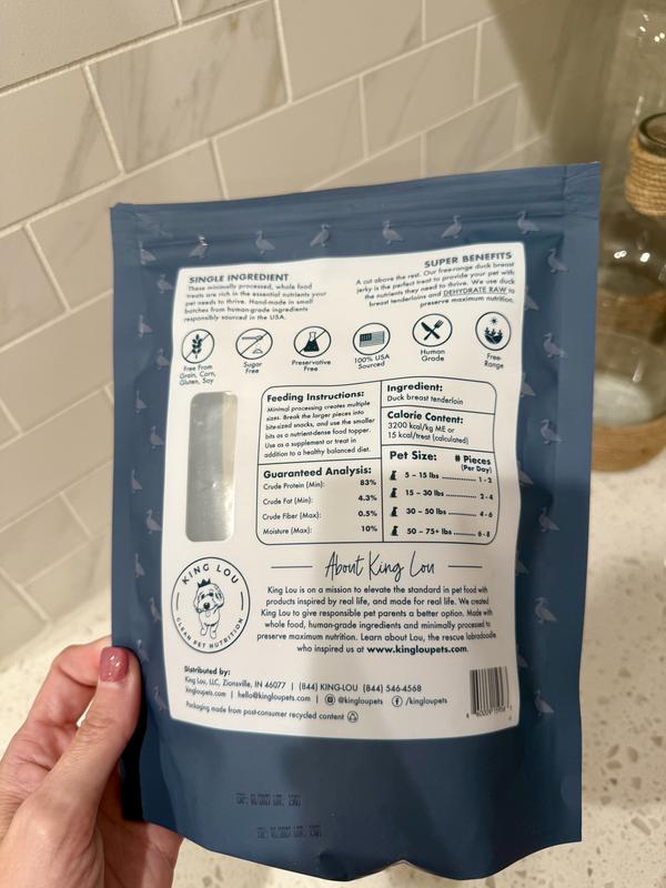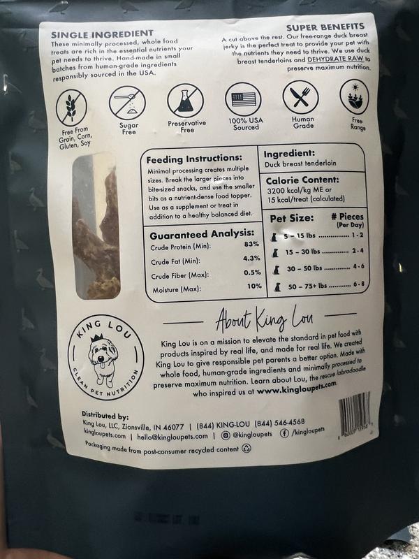 My dogs Sinn and Slayer love duck! I'm always on the lookout for duck jerky, but I'm a picky mom. King Lou duck breast jerky is made from free-range ducks 100% sourced in the USA. It's also human grade! It meets every requirement I have and Sinn and Slayer can't get enough of their afternoon snack!
