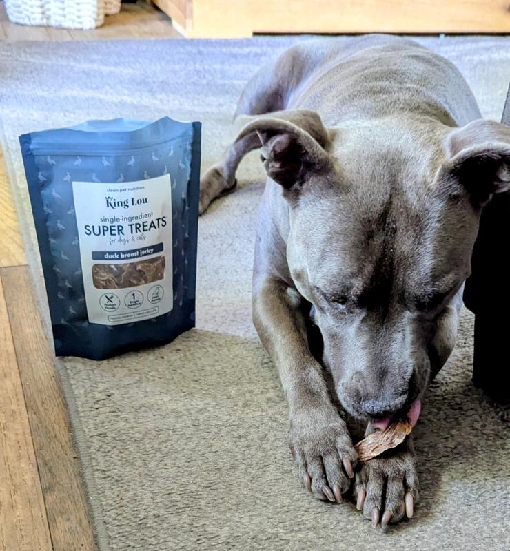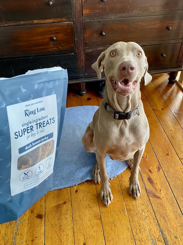 Our Weimaraner, Otto, was absolutely crazy about the King Lou duck breast jerky treats. One was not enough, he wanted more! These treats are firm jerky pieces, just one ingredient, so good for large dogs like Otto that have allergies! We will definitely be ordering more soon.