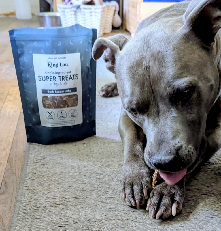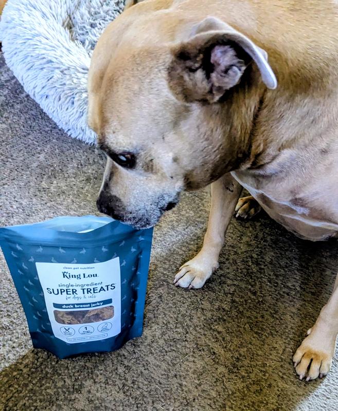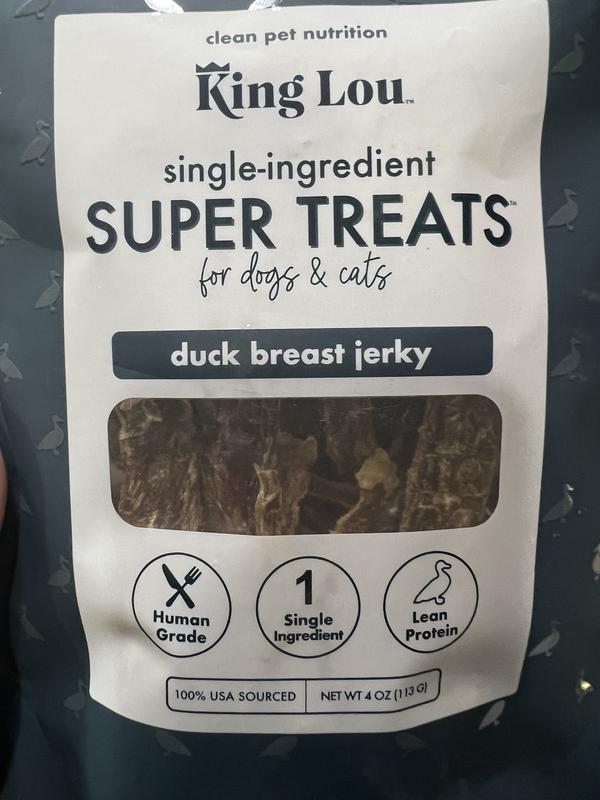 My dogs Sinn and Slayer love duck! I'm always on the lookout for duck jerky, but I'm a picky mom. King Lou duck breast jerky is made from free-range ducks 100% sourced