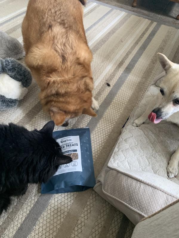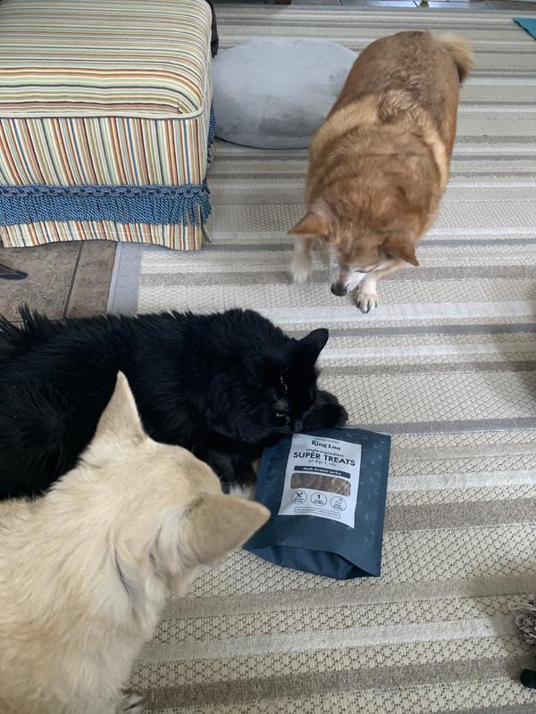 My dogs and cat have given this a quadruple A+. Willy wouldn’t even let the cat have any. As you can tell by the pictures, Willy walked away with the bag. He did not want to share. I had to break up the pieces for Chi Chi and Kitten, they both have smaller teeth. Hard treats are difficult for them to chew. But once broken up, they loved it. Thank you for the chance to sample King Lou super treats duck breast jerky for dogs and cats. I recommend this product highly.