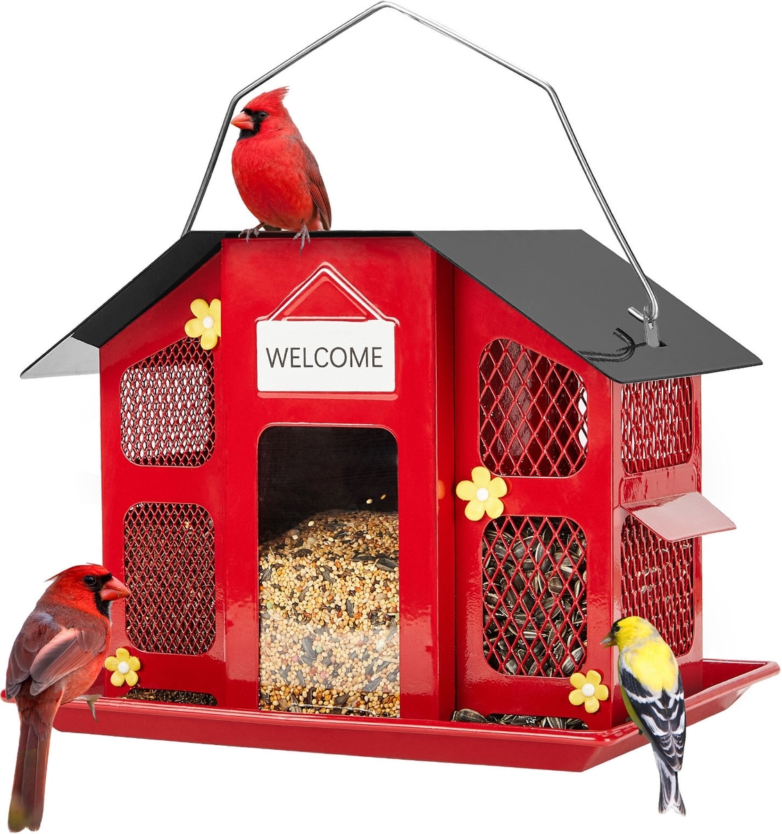 Kingsyard Weatherproof Metal Mesh House Hopper Wild Bird Feeder, Black/Red