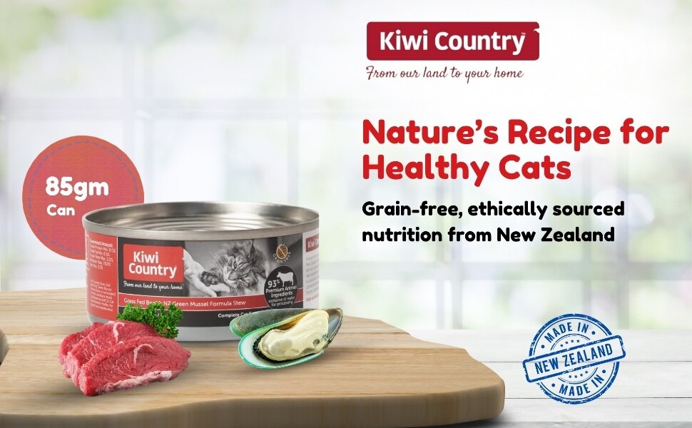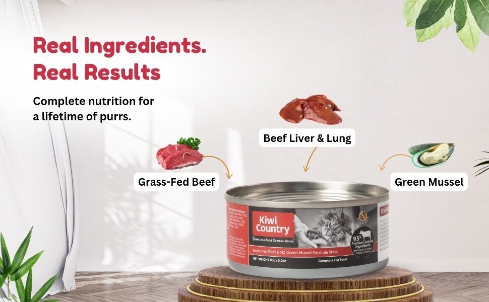 Water Sufficient For Processing, Beef, Beef Lung, Beef Kidney, Beef Liver, Salmon By-Products, NZ Green Mussel, Dried Yeast, Lamb Plasma, Cassia Gum, Guar Gum, Potassium Chloride, Taurine, Agar Agar, Calcium Carbonate, Choline Chloride, Iron Proteinate, Zinc Amino Acid Complex, Yucca Schidigera Extract, Vitamin B3 (Niacin), Vitamin E (Alpha-Tocopherol Acetate), Sodium Selenite, Manganese Proteinate, Copper Amino Acid Complex, Vitamin B1 (Thiamine Mononitrate), Vitamin B5 (Calcium Pantothenate), Vitamin B2 (Riboflavin), Vitamin B6 (Pyridoxine Hydrochloride), Vitamin A (Acetate), Vitamin B7 (Biotin), Vitamin B12 Supplement, Calcium Iodate, Vitamin B9 (Folic Acid), Vitamin D3 (Cholecalciferol).