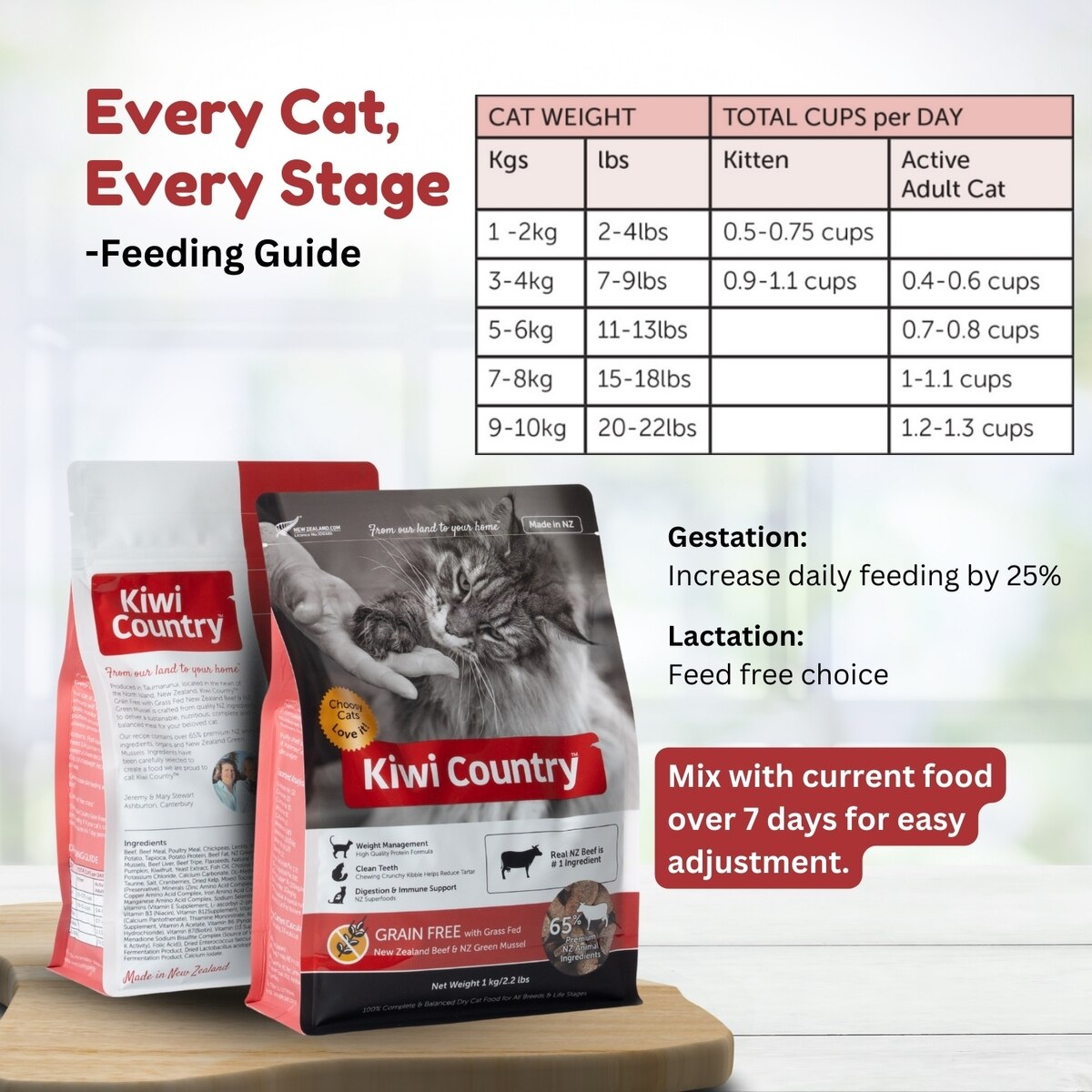 Transition to Kiwi Country Grain Free food by gradually adding it to your cat's current food over the course of a 7 day period.