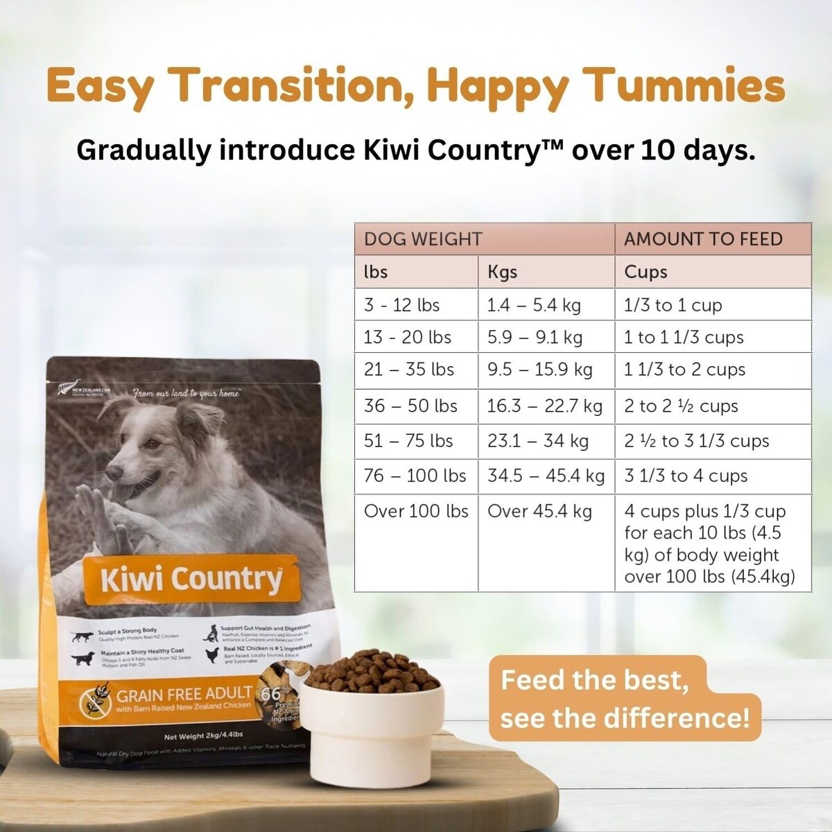 Transition to Kiwi Country Grain Free adult food by gradually adding to your pet's current food over the course of a 10 day period.