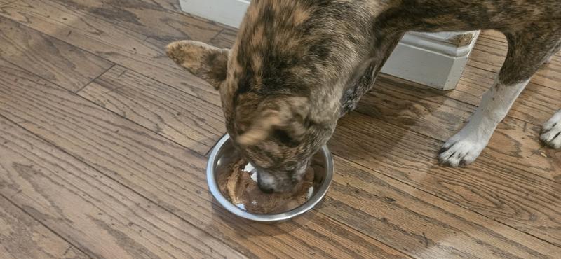 My 14yo Pitbull licked the bowl clean. He was so satiated he had a bounce in his arthritic step! This food is not too stiff or too soupy. Only a small meat like