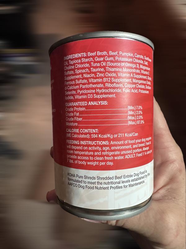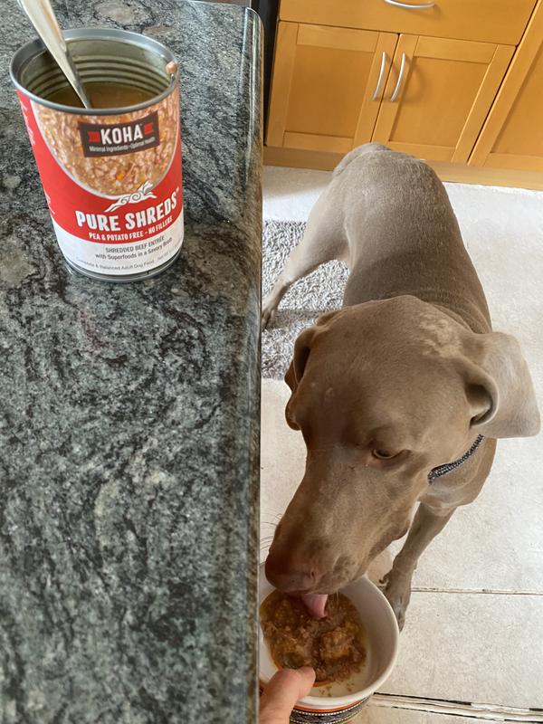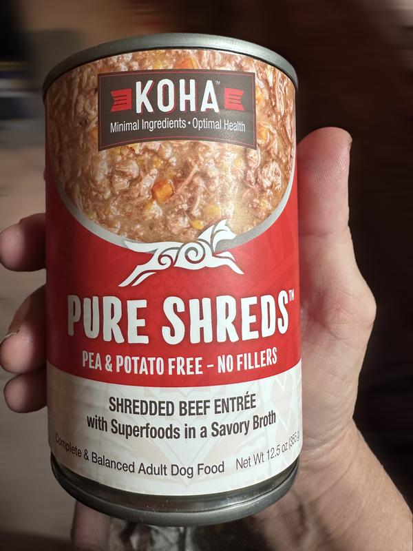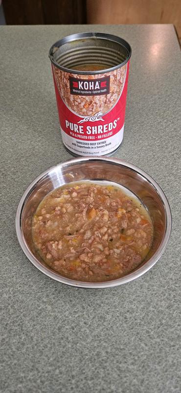 I have 3 very picky Russian Toys. I decided to try the KOHA pure Shreds Shredded Beef Entree. When I opened the can it smelled like homemade beef roast! All three of my girls ate it and wanted more! They are very small dogs and can't eat big chunks of food. The shreds are very tender and digestible and they loved the broth. I would definitely recommend this food for dogs that are hard to please!