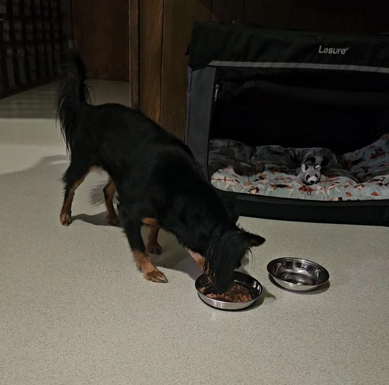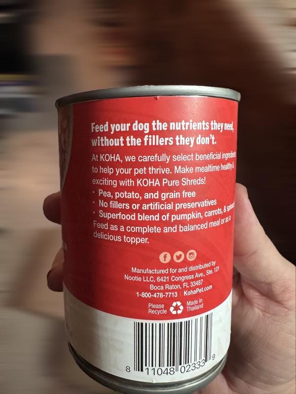 The KOHA beef shreds showed up in the middle of some old dog medical drama. The cans came well-packed and not dented, which is important for food safety. I like that it's a complete food, so I can swap it in without worrying if they're missing something, and the pumpkin is a bonus. The texture is pretty loose but has plenty of beef. Our picky princess is a fan of the chicken shreds, so I had high hopes for the beef shreds. She ended up needing extra hydration and ate the shreds with added water for a few days in a row. (This isn't a given; she refuses a lot!). Our old dude had surgery in the same week and was thrilled to get this food instead of kibble! Youngest also appreciated the bonus shreds - take a look at his expression when he smelled the bowl!