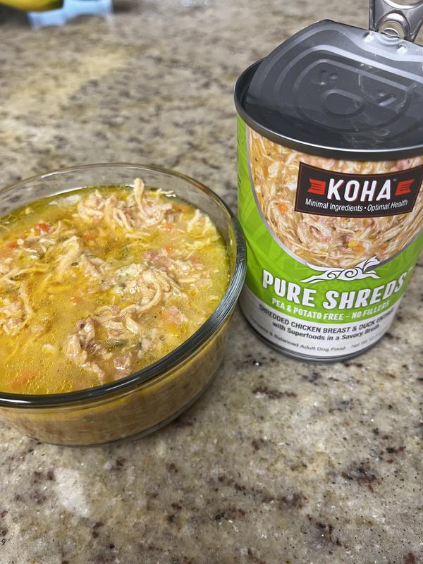 - DealKOHA Pure Shreds Chicken Entree High Protein Wet Dog Food, 12.5-oz can, case of 12$59.88 Chewy Price$56.89 Autoship PricePromo, Spend $100, Get $30 eGift Card with code NEWYEAR +2 deals