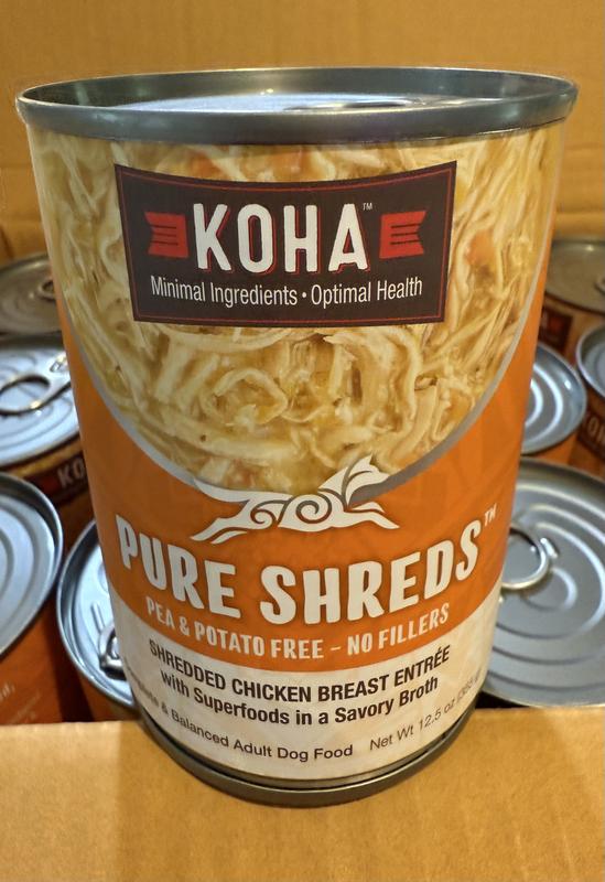 - DealKOHA Pure Shreds Chicken & Beef Entree High Protein Wet Dog Food, 12.5-oz can, case of 12$59.88 Chewy Price$56.89 Autoship PricePromo, Spend $100, Get $30 eGift Card with code NEWYEAR +2 deals