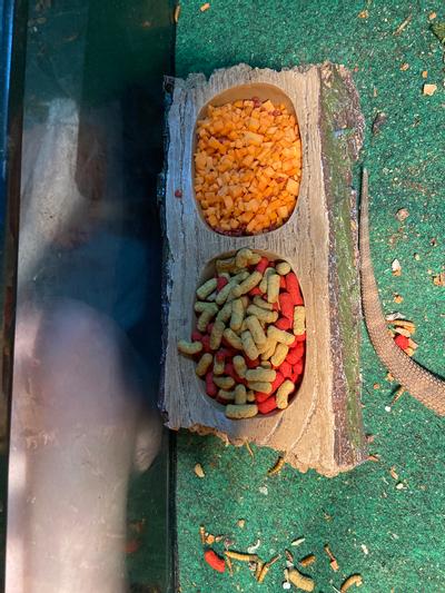 Holds a decent amount of food and water in it. Has a cover perfect for your pet on a food schedule to cover up leftovers so no bugs get in.