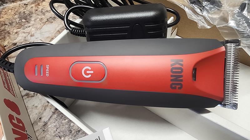 Kong 2 Speed Stainless Steele Clippers. Includes 6 varying blade lengths, oil to lubricate the blade, brush to remove excess hair. 8 foot long cord…so no need to worry about a battery dying while you are working on your pet. Two motor speeds, not too loud, I included a video running both speeds. A nice feature is that it has a light on the end to help visibility while trimming your pet.