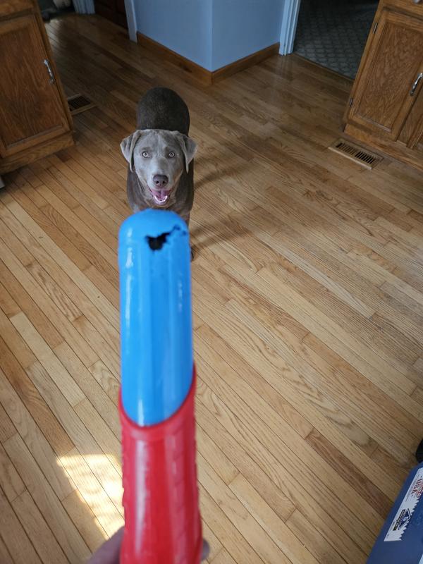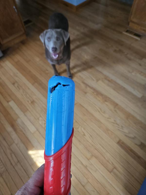 I bought this at Christmas for our Yellow English Lab He's a hard chewer. He ribbed the top of the stick off in about 5 minutes. This toy is supposed to be indestructible. It's not! I threw it out. $13.00 down the drain!