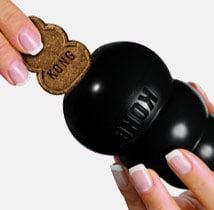 STUFF: Stuff loosely for beginners or tighter for more advanced users (w/KONG Snacks or your dog's favorite kibble).