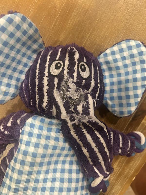 This toy features an internal knotted rope with minimal stuffing and is made out of polyester.