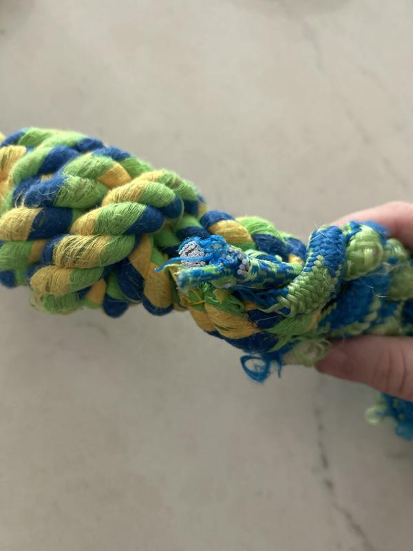This toy has held up well with our two energetic puppies playing tug of war without any signs of fraying. They thoroughly enjoy playing with it together or individually