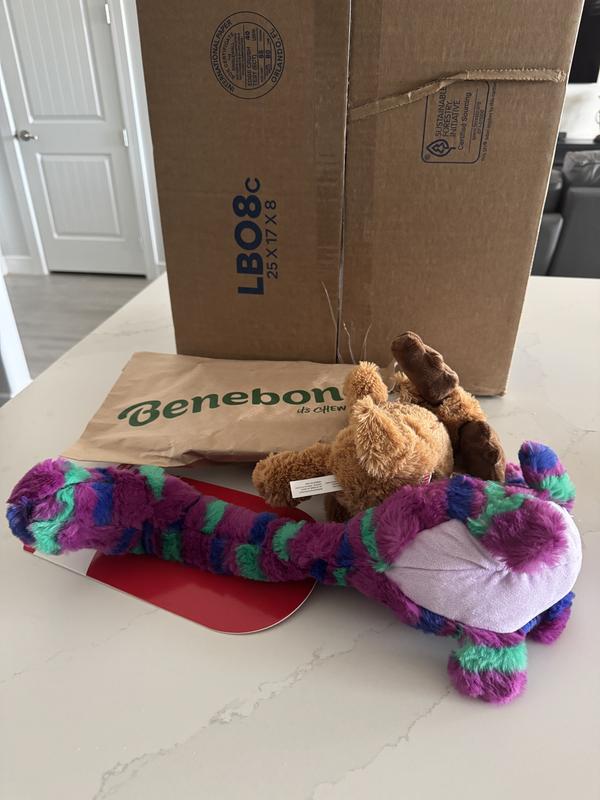 This was a really cute toy and much bigger than I expected. I was hoping that my dog would love it and he did however he loved it so much that he ripped it apart in less than 10 minutes. Now that he’s matured a bit I may get him another one and see how it goes But if you have an active chewer or puppy you may not get your moneys worth from this toy