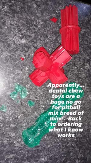 So my pup loved this toy a little too much. Kong has been about the only brand that can hold up to his aggressive chewing (he’s a lab/Dalmatian mix), so I got this hoping to help keep his teeth clean. It’s a great toy and I could tell it was doing the job, but it lasted maybe six hours! As soon as I gave it to him, he just loved it and wouldn’t let up. He chewed off one of the ends and swallowed the chunks (thankfully he passed them without trouble), so I had to take it away pretty quickly. Definitely a great dental chew, but not for a chewer of his caliber! It would work best for a light or average chewer.