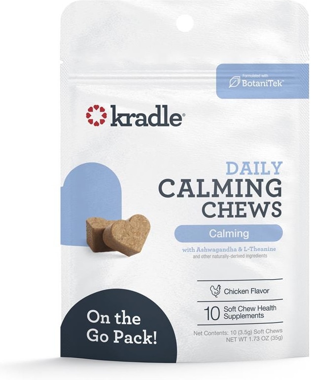 - Kradle Calming Chillers Chicken Flavored Hard Chew Calming Supplement for Dogs, 6 count$29.94 Chewy Price$29.99 List Price$28.44 Autoship PricePromo, New Customers Only: Spend $49+, Get $20 eGift Card +2 deals