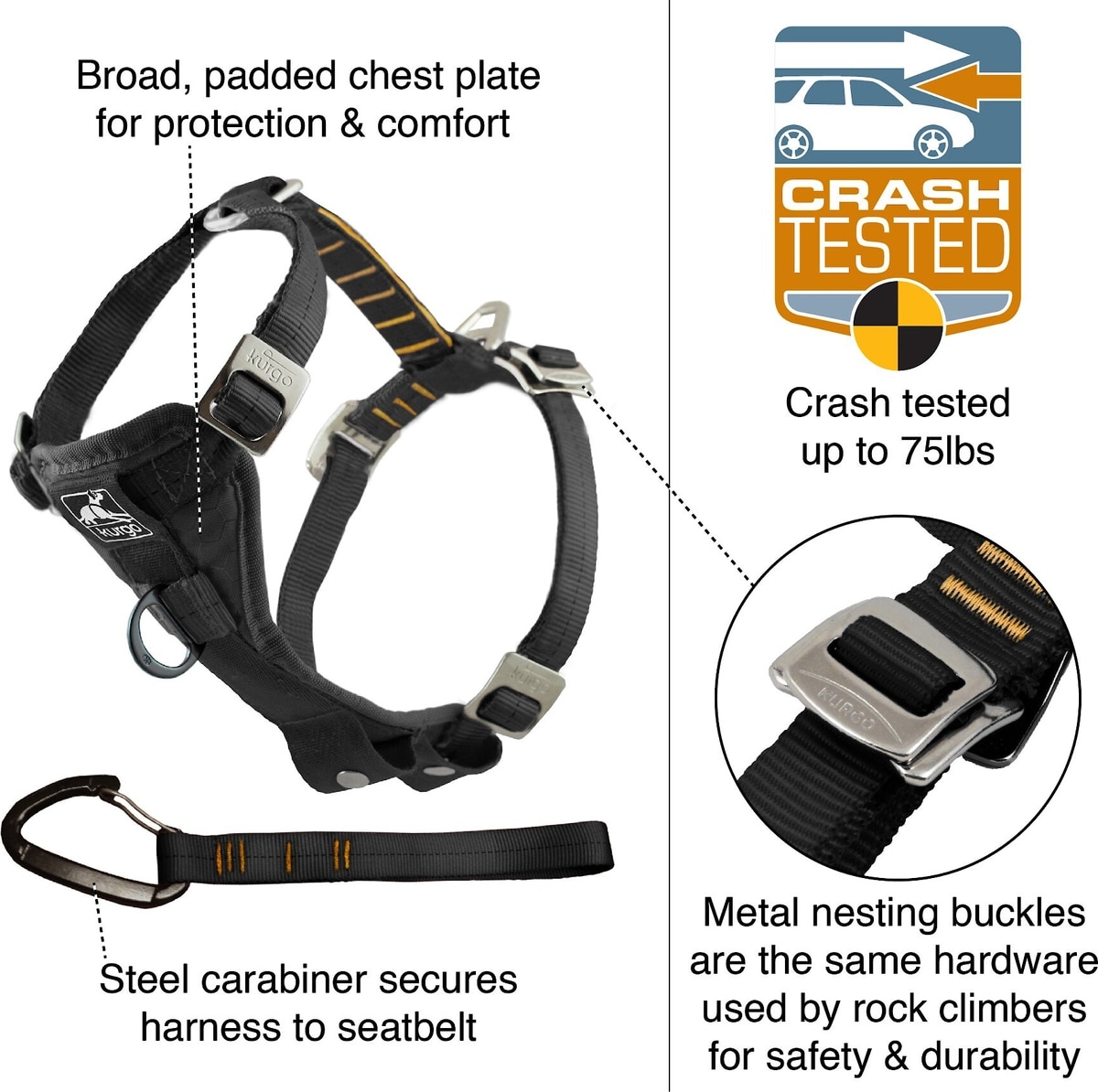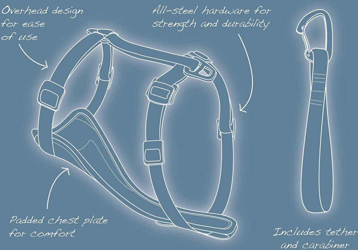 • This harness includes a crash-tested seatbelt tether for ultimate safety during car trips.