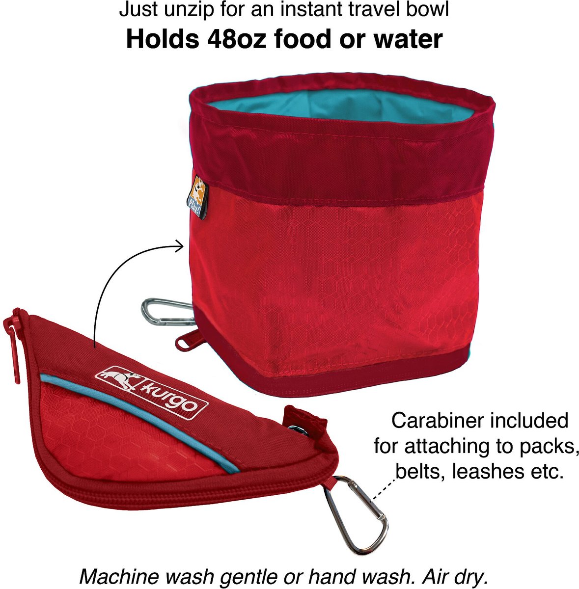 I tried a rubber, collapsible bowl in a store and was disappointed that they seem to snap back into their flat shape rather easily, not a good option for me or my pup, so I tried this instead. I have a nervous eater who doesn't like strange or new bowls and sometimes gets scared of the ones she's familiar with. There are days when this is the only thing she'll drink from. The fabric doesn't make a clanging noise and it seems like a water-filled toy to her rather than a scary bowl. She'll even drink from it at the vet! It also has a similar color and fabric to my Kurgo treat bag, creating a positive association, and I love that I can just zip it up and hook it to my belt or fit it into a bag easily. We recently spent a day at a friend's house and I was able to whip this baby out and keep the kid watered all afternoon, with no fuss or tension. Will be buying a second one for food.