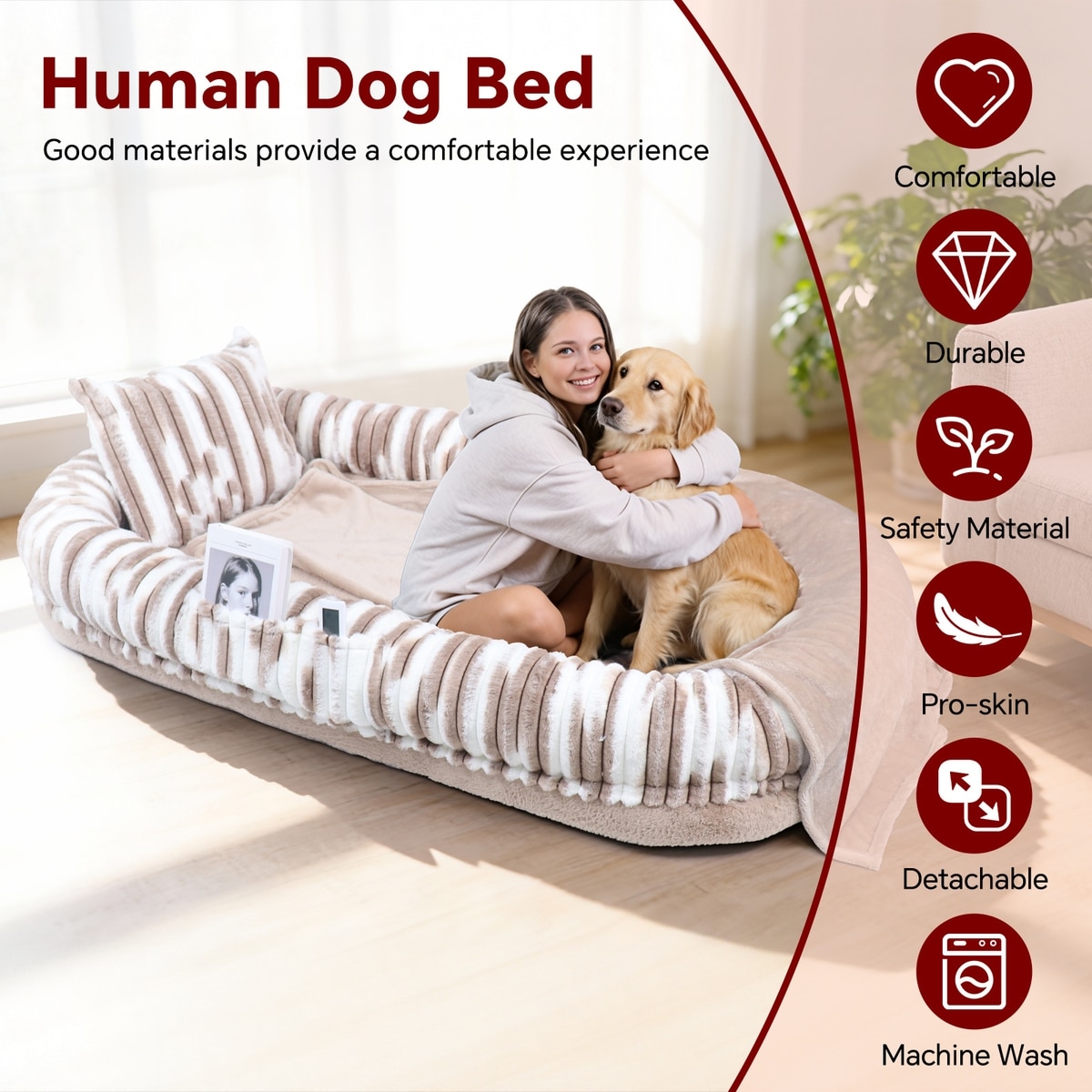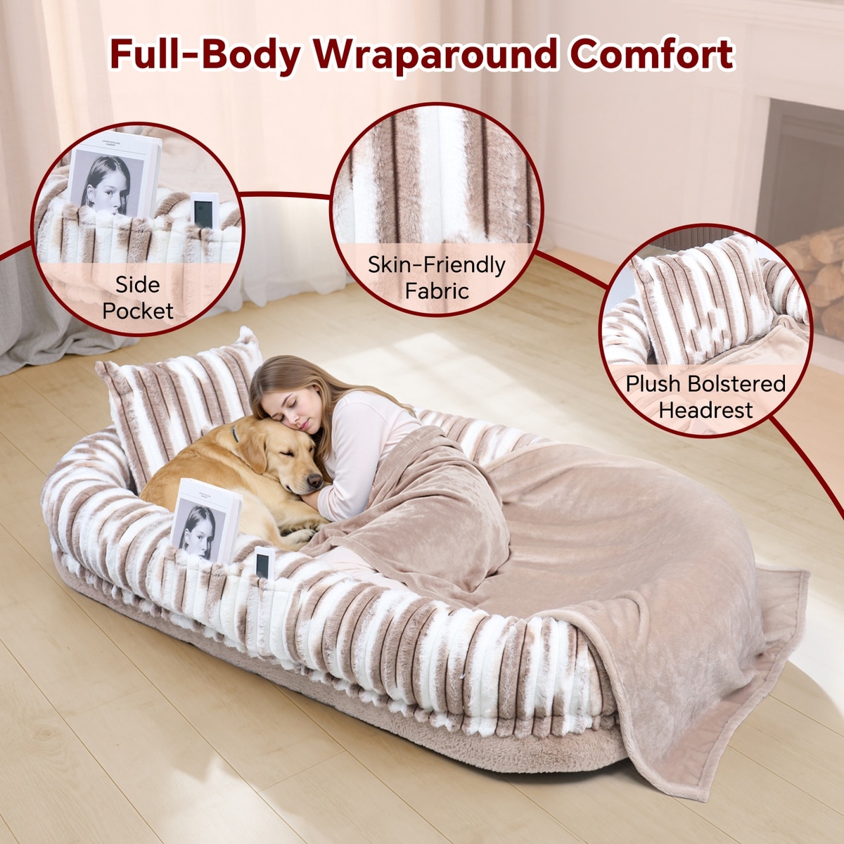 The faux-fur cover is exceptionally soft, warm, and durable. It also has a side storage pocket to hold small items while you and your best bud are lounging.