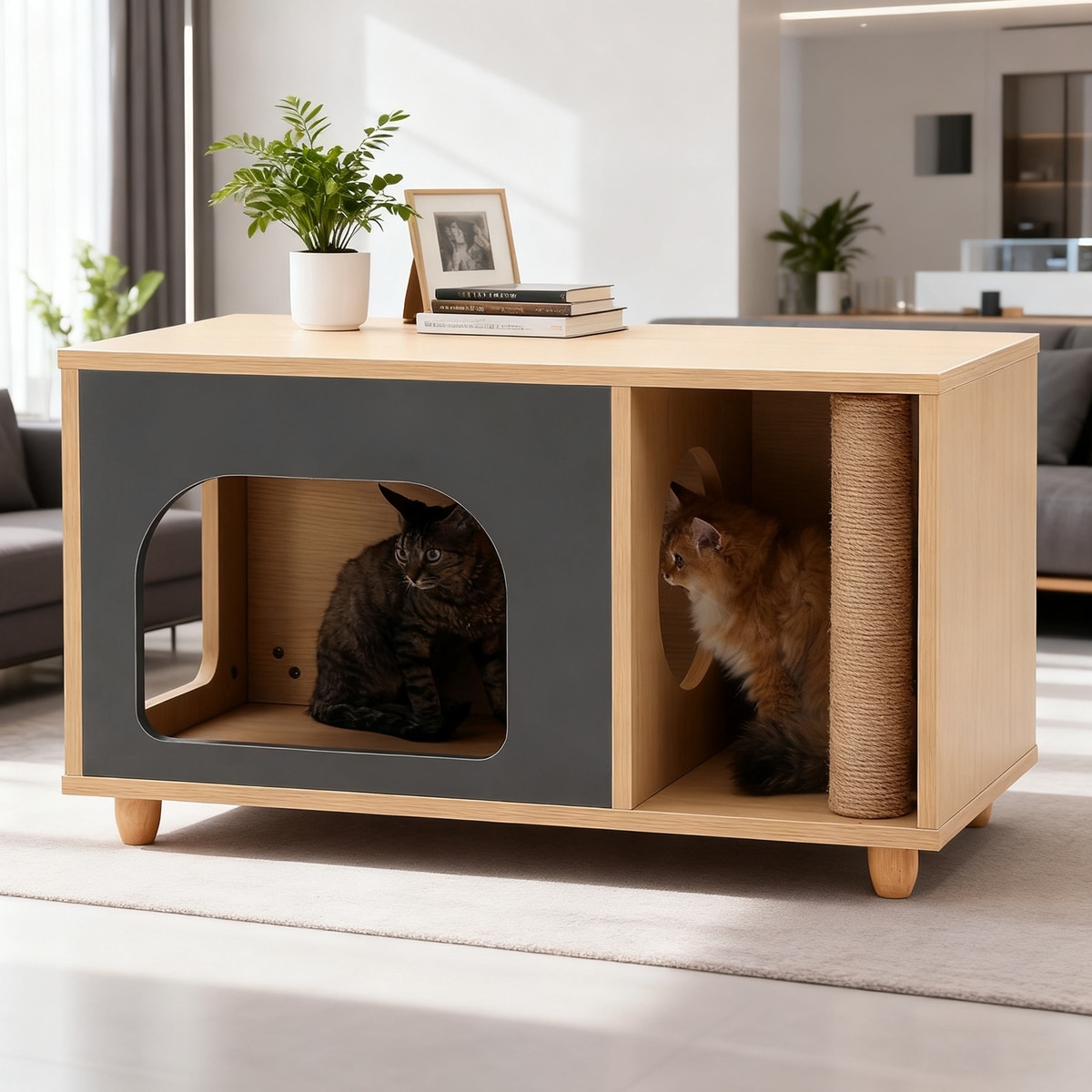 Features table legs that allow for a robot vacuum to clean underneath; 2 semi-open pet nests that provide your pet with easy access, and a scratching post.