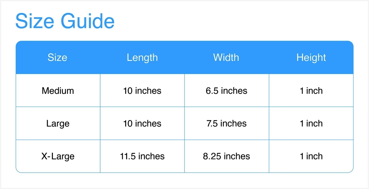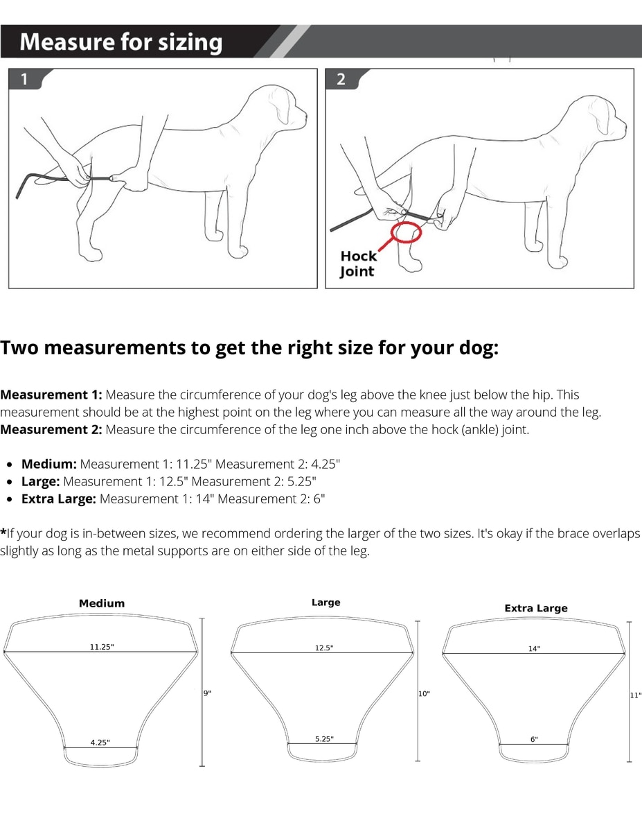 For the knee brace sizing you will need to take two measurements: the circumference of the injured leg just above the knee joint, and the length of the leg from that point above the knee, down to an inch above the hock joint. It is also helpful to take into account your pup's weight. Once you have those numbers, you can compare them to this chart to figure out which size will most likely fit best: