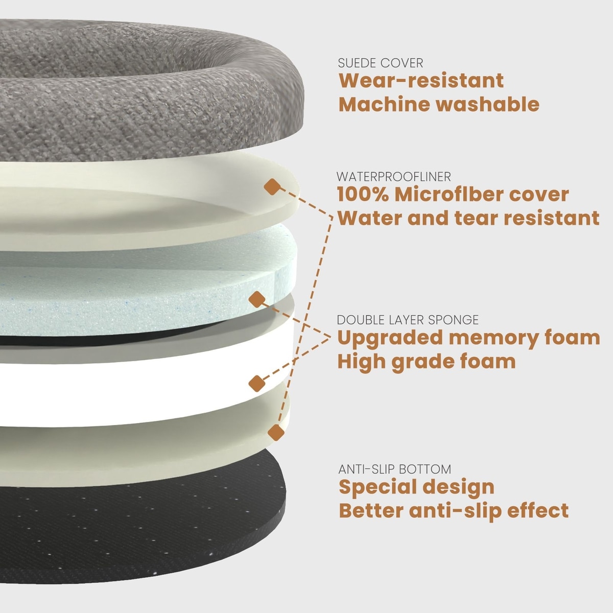 A fully enclosed waterproof liner wraps around the entire foam interior, guarding against spills, accidents, and moisture. On the bottom, a textured anti-slip base keeps the bed steady on any surface—no more shifting or sliding.