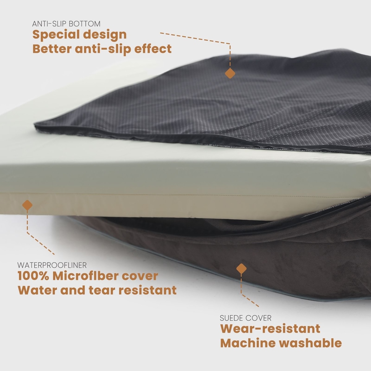 A fully enclosed waterproof liner wraps around the entire foam interior, guarding against spills, accidents, and moisture. On the bottom, a textured anti-slip base keeps the bed steady on any surface—no more shifting or sliding.