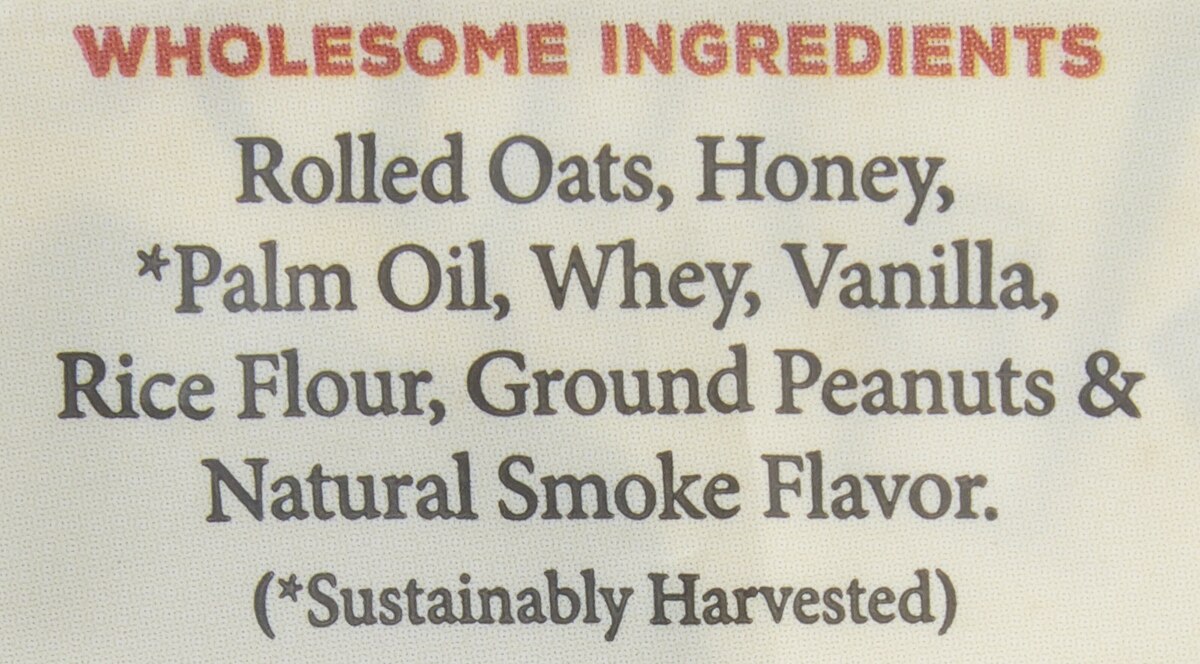 Rolled Oats, Honey, Coconut Glycerin, Whey, Vanilla, Rice Flour, Ground Peanuts & Natural Smoke Flavor.