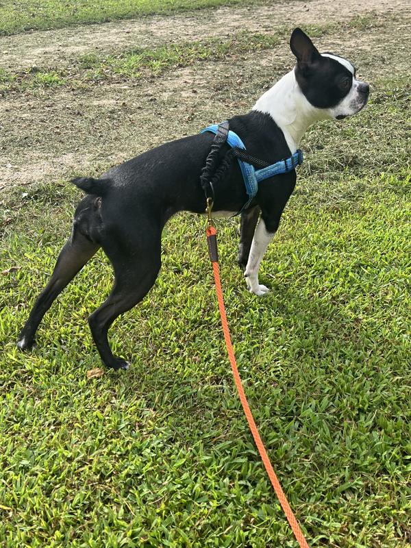 My dog is general good on a leash… until there are people. She LOVES people! Everyone is her best friend even if they don’t know it yet. That being said, she tends to be a puller and jumper. So we went on a walk and I have to say this harness worked quite well. The bungee feature was especially useful so it didn’t feel like she was straining herself as she usually does. I think the design of it going across the upper part of her legs was also beneficial in keeping her at bay. She still jumped and whatnot but that’s just a her thing in general. This was also super easy to put on which is great with a very excited pup. Overall I think this helped and will get us one step closer in our training.