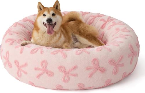 Lesure Calming Cute Modern Plush Jacquard Shaggy Orthopedic Anti-Slip Donut Dog & Cat Bed with Removable Cover, Pink Bows, Large
