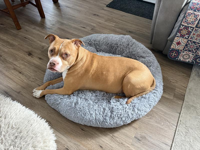 We ordered the large round cuddly anti-anxiety dog bed, and after giving it the full two days to completely fluff up, it looks fantastic! Our dog is 80 pounds (a little over the “up to 75 lbs” recommendation), and we were pleasantly surprised at how well he fits. She sinks in just enough to feel cozy and supported, while still having room to curl up. The material is soft, inviting, and really does create that nest like comfort that helps her relax, she goes right to it whenever she needs downtime. It’s not orthopedic, so if your pup needs firm joint support this may not be the right choice, but for a cuddly, calming bed, it’s perfect. We’re happy with the purchase and so is our big girl!