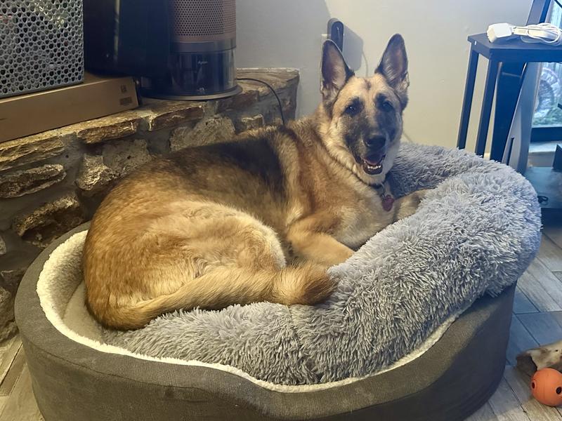 We ordered the large round cuddly anti-anxiety dog bed, and after giving it the full two days to completely fluff up, it looks fantastic! Our dog is 80 pounds (a little over the “up to 75 lbs” recommendation), and we were pleasantly surprised at how well he fits. She sinks in just enough to feel cozy and supported, while still having room to curl up. The material is soft, inviting, and really does create that nest like comfort that helps her relax, she goes right to it whenever she needs downtime. It’s not orthopedic, so if your pup needs firm joint support this may not be the right choice, but for a cuddly, calming bed, it’s perfect. We’re happy with the purchase and so is our big girl!