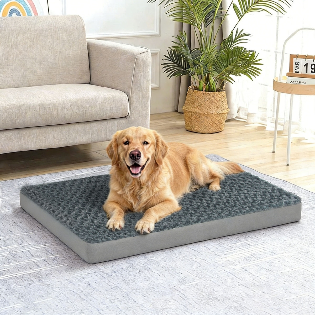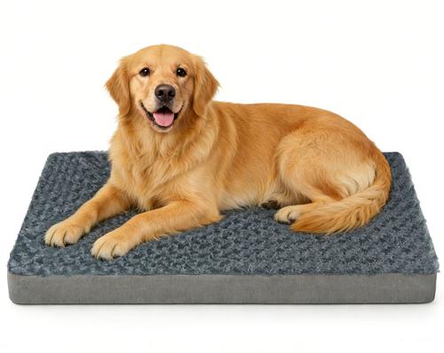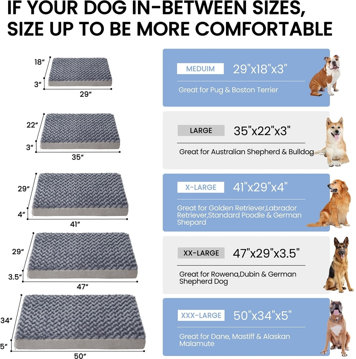 I wish I could give this very comfy, generously sized dog bed 5 stars, but here are the CONS (the pros will follow): 1. it has a chemically odor, I believe from the fabric of the cover (sides and/or bottom); if I can smell it I'm sure a dog can. 2. the box had super basic, limited-English instructions printed on the outside; there is no literature included in the box. 3. I had no way of knowing which side of the memory foam insert should be placed facing up or down; I used my brain to decide the waterproof-looking fabric side should probably face up. PROS: 1. generous size, approx 29"x40"; definitely enough for our mid-to-large sized Siberian Husky. 2. very comfy feeling memory foam; probably great for a senior dog (albeit very active still) like ours; no idea how long it will retain its bounce-back ability. 3. very soft, comfy plush cover; I like the dusty blue color, and the zipper on 2 sides. 4. even the memory foam insert has a zipper cover. Other things to be aware of: the as-mentioned limited instructions don't indicate how long it will take for the squooshed memory foam to expand. I gave it 18 hours and it seemed to be enough. I finally enticed our Sibe to get on the bed, and he stayed for a while. Possibly because of the smell. I'm hoping it will finish out-gassing and he'll come to enjoy it. But if you know Sibes, you know they can be finicky. My understanding is, too, that dogs like the way their beds smell like THEM -- like, don't wash it so often!