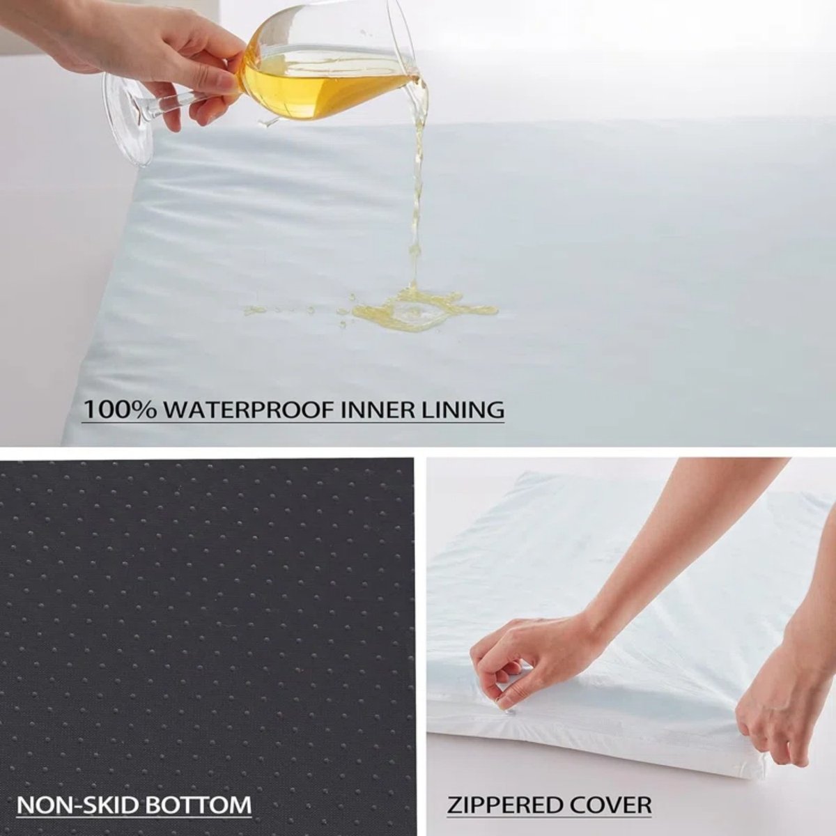 Only “waterproof/ resistant” on top, not bottom, so when liquid ran over side, gets wicked up into the bottom and bed is ruined Inner cover does not come off so