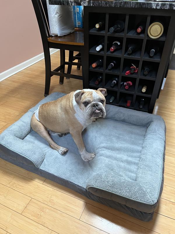 First, I was really surprised that a large pet bed arrived in such a small box. But once I opened it, everything filled up with air and assumed a good shape. I received the large bolster sofa, which is probably way too big for my English bulldog. There were no instructions, so I wasn’t sure which way to insert the bottom cushion. It is a beautiful and amazing pet bed. It is nice and large and soft. My dog loves the raised sides to rest his head on. The color is great as it is neutral And hides stains and dog hair. My dog is older, and prone to accidents. He was so excited with his new bed, that he did have an accident on the bed. The top cover is not waterproof. The urine soaked through to the mattress. Fortunately, it was easy to clean, and looks good as new again! My dog loves that he has an extra bed to relax in.