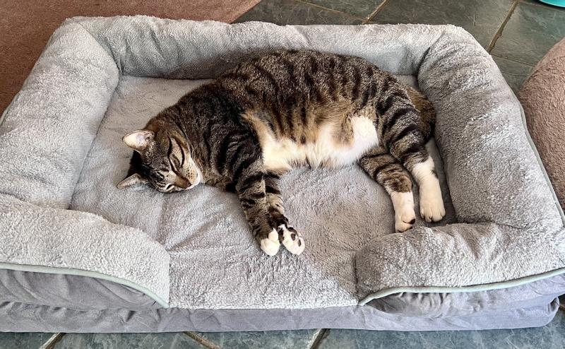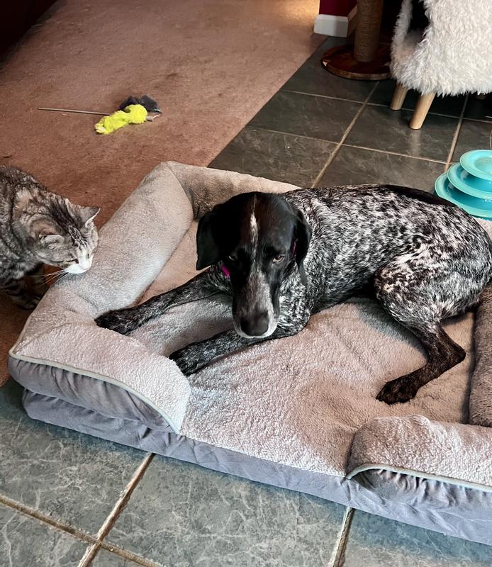 This bed has become one of the most coveted spots in our home. It features a plush, cushioned surface that’s perfect for sinking into, and its cozy design makes it irresistible. Whenever our energetic German Shorthaired Pointer isn’t nestled comfortably in it, one of the cats has likely claimed it as their own. It’s quite entertaining to see the playful competition between them for this favorite lounging spot, as my GSP loves to curl up there after a long day of adventures. The bed has become a central hub of comfort and relaxation for our furry family members.