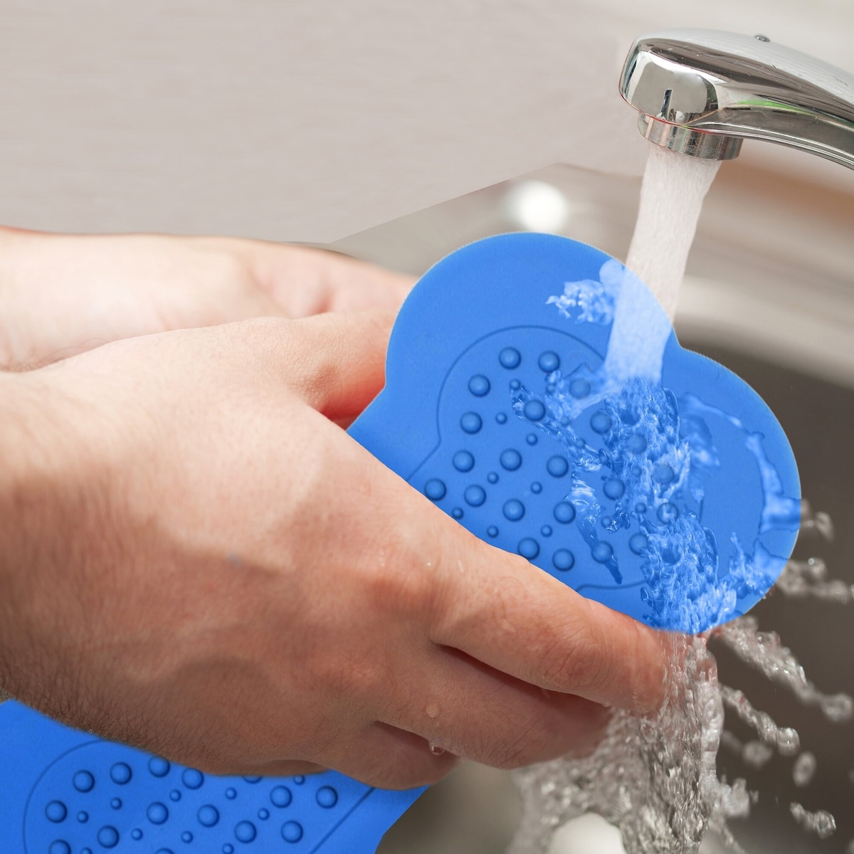 This lick mat should be cleaned using warm water and soap , then dried clean before next use.