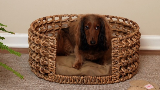 This is such a cute dog bed! I love the natural wicker high sides with the easy to get in/out square opening. It comes with a padded bed that is tan in color. The