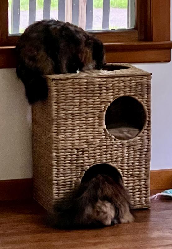 I have two older cats and two younger cats and they all love this. I call it their kitty condo. They sleep on top and they sleep in the two. I call them bedrooms