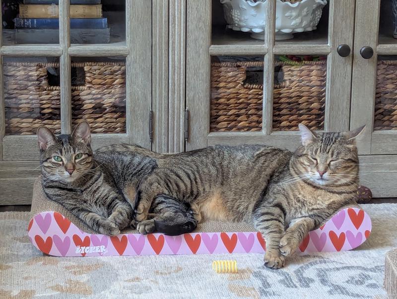 My multiple cat household loves this lounge bed cat scratcher! It's big enough for the two smallest cats who are sisters to share. I gave one to my neighbor for