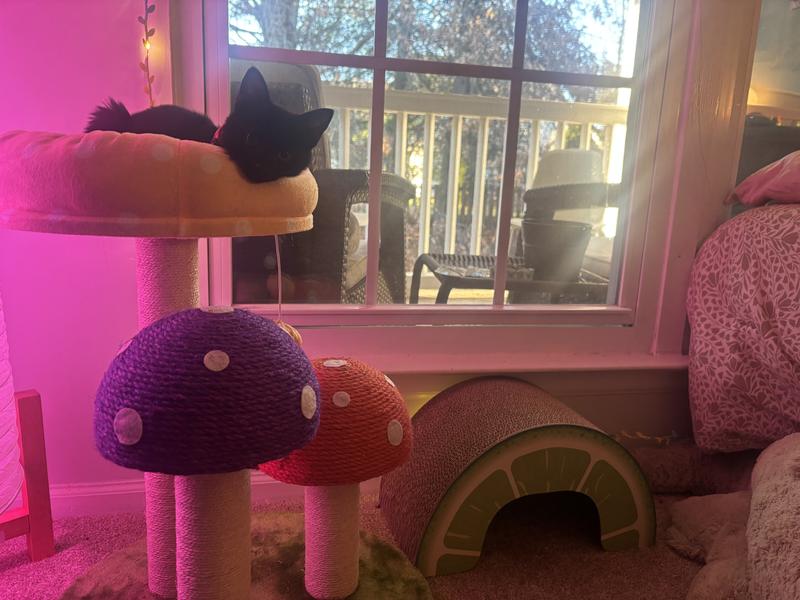 This mushroom cat tree was super easy to put together, good quality, and looks exactly like the product photos! My kittens are obsessed with it and sleep on it all the time. They also love playing with the little hangy bit and swatting at it from the different mushroom caps. So super cute!