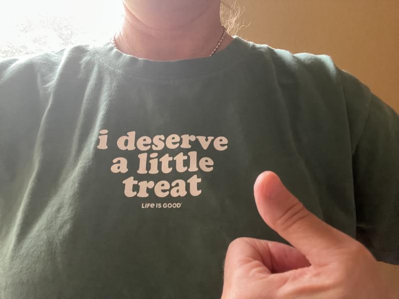 This tee is everything I hoped for and more. The “I Deserve A Little Treat” message is a whole vibe. The boxy fit is relaxed and the fabric is soft right out of