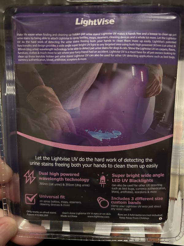 1) Insert 2 AAA batteries (not included) on back of Lightvise. 2) Clamp onto item by opening & closing rubber latch. 3) Turn on/off using power switch on back. 4) Magnetic feature built in on back. 5)Point to area where you want to inspect for pet urine stains.