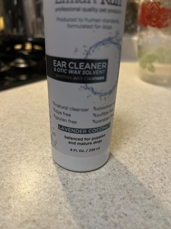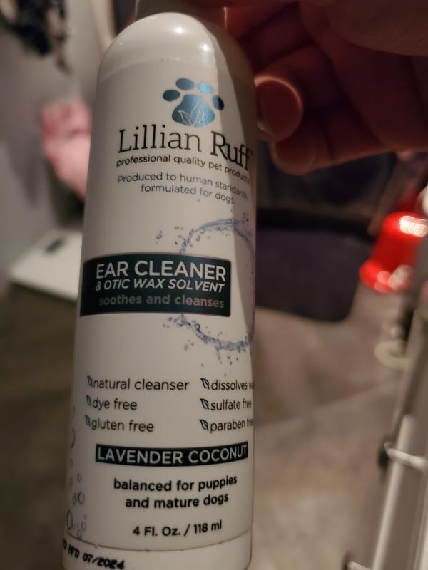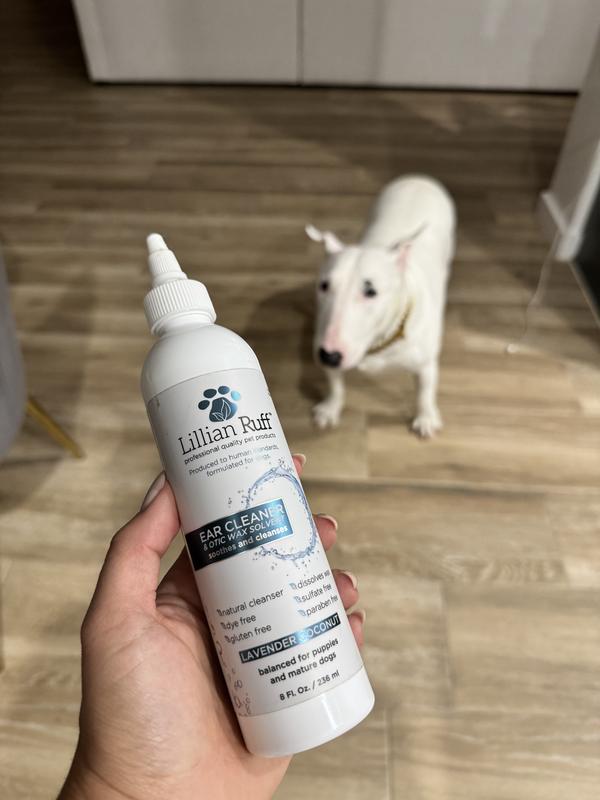 I’ve been using Lillian Ruff Dog Ear Cleaner on my 60lb adult white bull terrier, and it’s made a huge difference! The gentle, non-stinging formula keeps his ears clean without any irritation — even though he’s prone to scratching and redness. I love that it has a pleasant lavender and coconut scent, so his ears smell fresh instead of like chemicals. It’s also effective at removing wax and buildup without leaving any greasy residue. The easy-pour bottle makes cleaning quick and mess-free. Definitely my go-to ear cleaner from now on that we will be adding to his routine to help prevent any waxy buildup and ear issues. Not to mention I am pleased with ingredients.